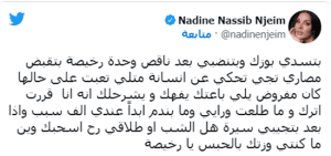 فردّت نادين على تغريدةِ المغرّدة، محاولةً أن تردّ الصاع صاعين وتلقينها درسًا قاسيًا،فقالت: “بتسدّي بوزك وبتنضبّي، بعد ناقص وحدة رخيصة بتقبض مصاري تجي تحكي عن انسانة متلي تعبت على حالها. كان مفروض يلي باعتك يفهّمك ويشرحلك انه انا قرّرت اترك وما طلعت ورايي وما بندم ابدًا. عندي الف سبب”.