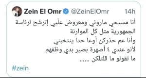 غرّد الفنان اللبناني زين العمر عبر حسابه الخاص بموقع التواصل الإجتماعي تويتر، فدوّن “أنا مسيحي ماروني معروض عليي إترشّح لرئاسة الجمهوريّة متل كل الموارنة”.