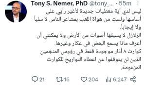 كتب “الباحث” في الجيولوجيا في الجامعة الاميركية طوني نمر، في تغريدة على حسابه عبر “تويتر”: “ليس لدي أية معطيات جديدة لأغيّر رأيي على أساسها ولست من هواة اللعب بمشاعر الناس لا سلباً ولا إيجاباً”.
