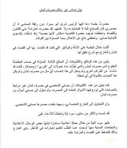 صدر عن حاكم مصرف لبنان رياض سلامة بيان عن جلسة الإستماع إليه، ولفت إلى أنّه أكّد خلال الجلسة على الأدلة والوثاق التي كان قد تقدّم بها إلى القضاء في لبنان والخارج مع شرحٍ دقيق لها.