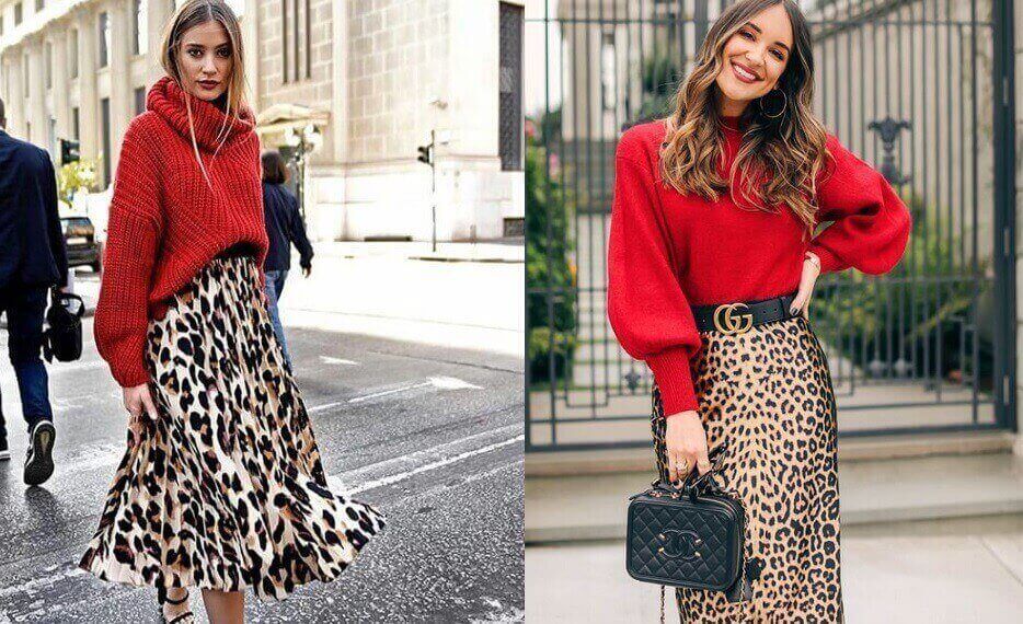 الكنزة الحمراء مع تنورة بنقشة النمر