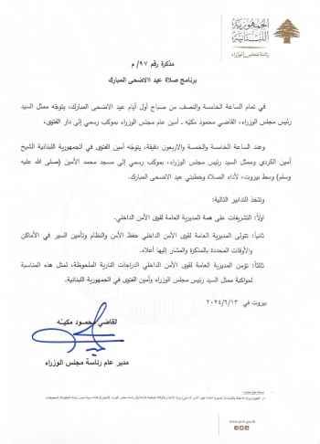 لبنانيات رئاسة مجلس الوزراء أصدرت مذكرة ببرنامج الصلاة في عيد الاضحى المبارك في 15/06/2024 شارك FacebookTwitterWhatsAppTelegram